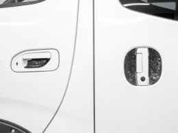 ドアハンドル形状(くぼみ)に合わせてカットされた専用設計で、表面の艶を控えめにしたジオメトリック柄がドアハンドル部をさり気なくドレスアップします。